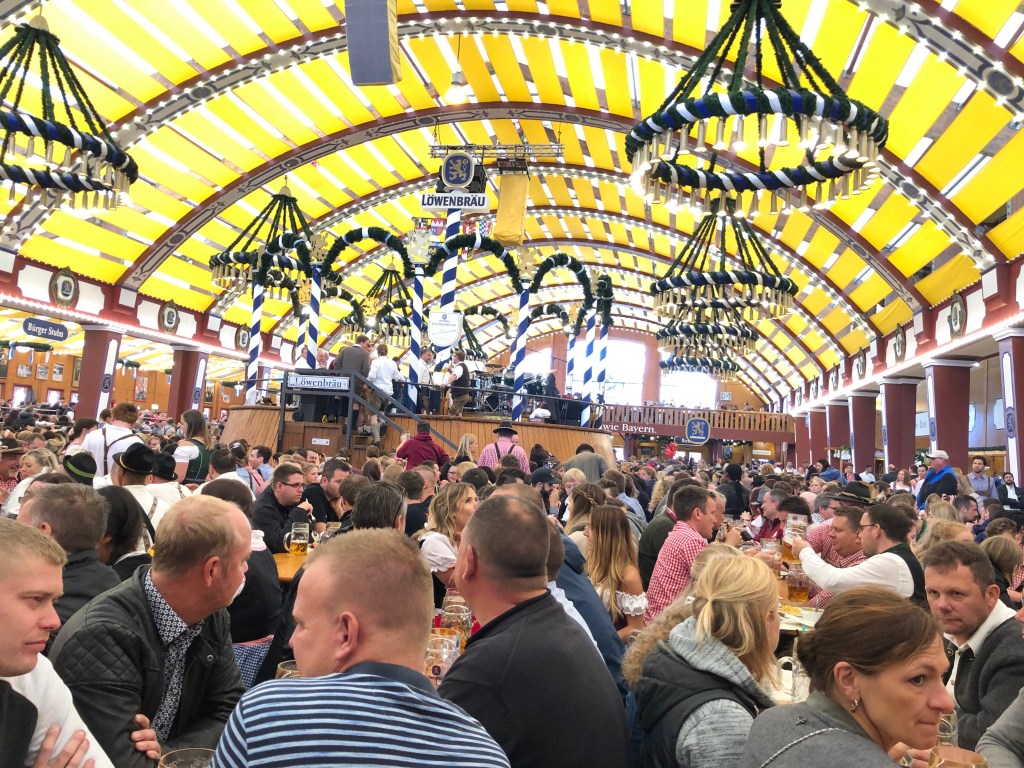 Outside the tents it looked like a crowded carnival or festival. Inside each tent were thousands of people eating and drinking and singing. Only one beer is served in each tent, but the menus were relatively large. I wound up having a bratwurst, chicken soup, and half chicken, a couple of potato dishes, a pretzel, and fried dough.