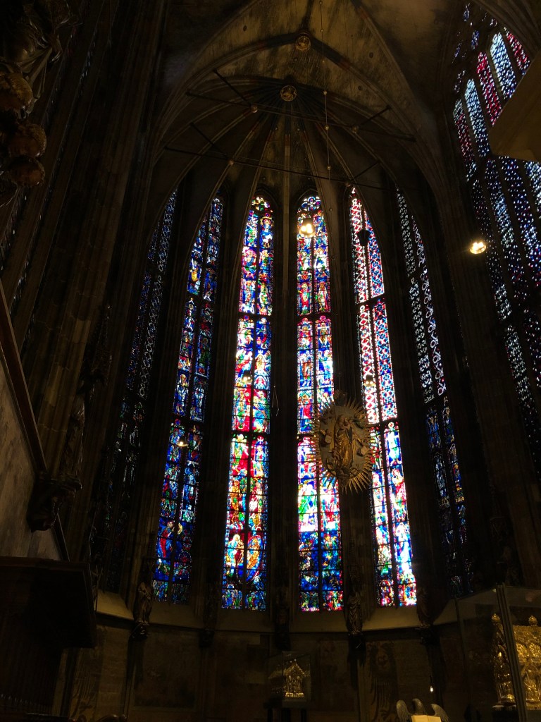 Then I went inside. Holy moley frijole! We just can’t build buildings like this anymore. And I’m sure will never again. I was further blown away by the glass, the scale, the sound quality, the materials, the verticality of it all. Surrounding the altar were fancy floor inlays and all sorts of displays and treasures, including what looked like a papal sarcophagus (which happens to be the name of my new band). I left this place in complete awe of it. Who would’ve thunk I’d fall in love with a Catholic German?