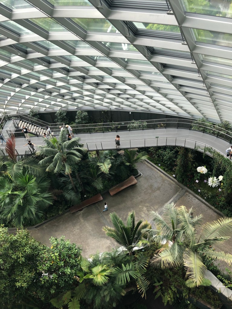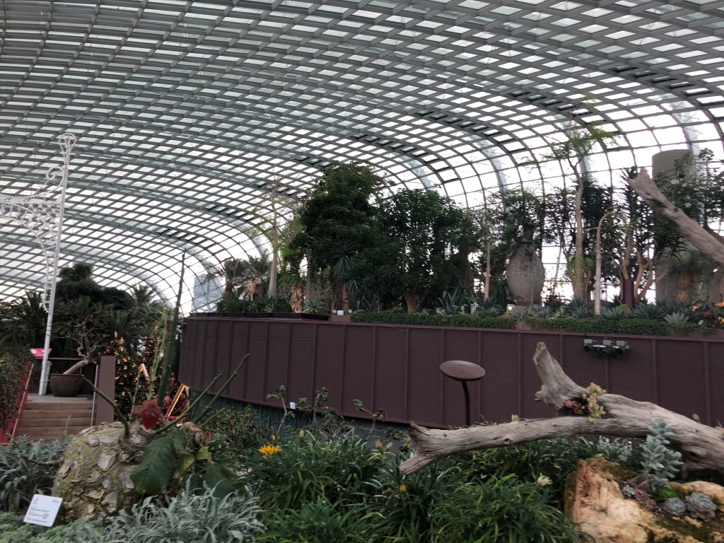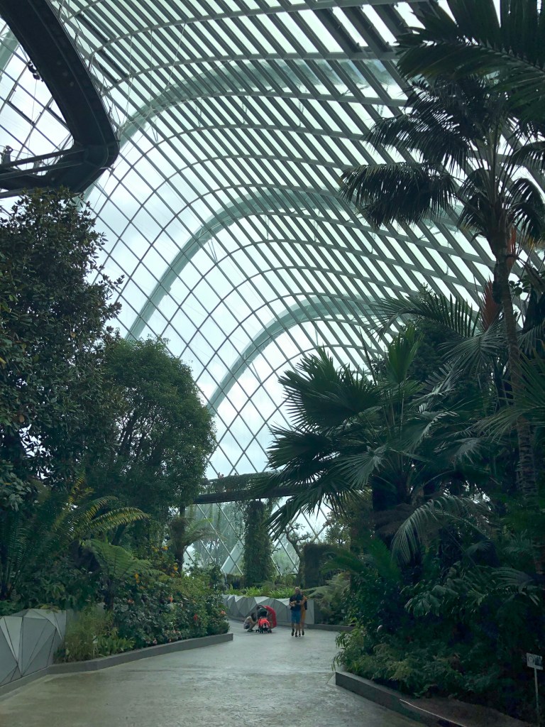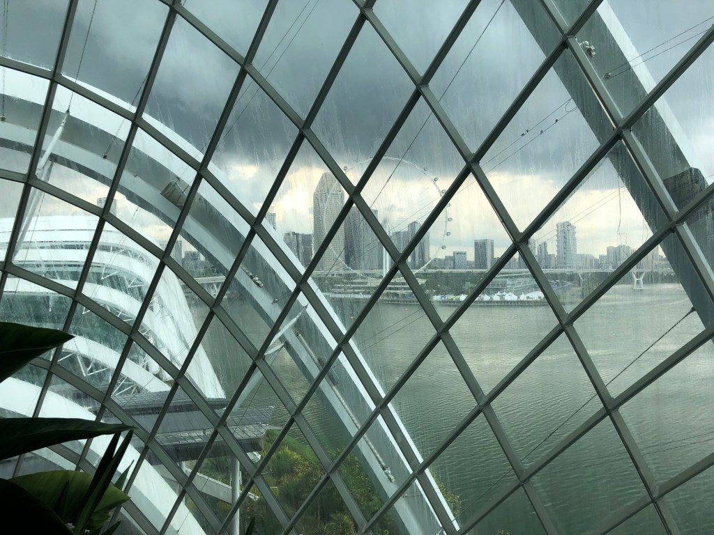 Then to the Sands at Marina Bay. I went to observation deck on floor 56. The roof gardens and infinity pool are for guests only. I would’ve liked to have seen it but not worth the $1000+ for a room (they get as low as $500 in February). The views of the city were good and the outdoor space was nice, but this was about 100 floors lower than where I stood in the Burj Khalifa. I had been ruined. After I had gotten my fill of roof action, heavy clouds came overhead. Back downstairs it was raining on one side of the building and not the other. I waited it out to go to gardens by the bay.