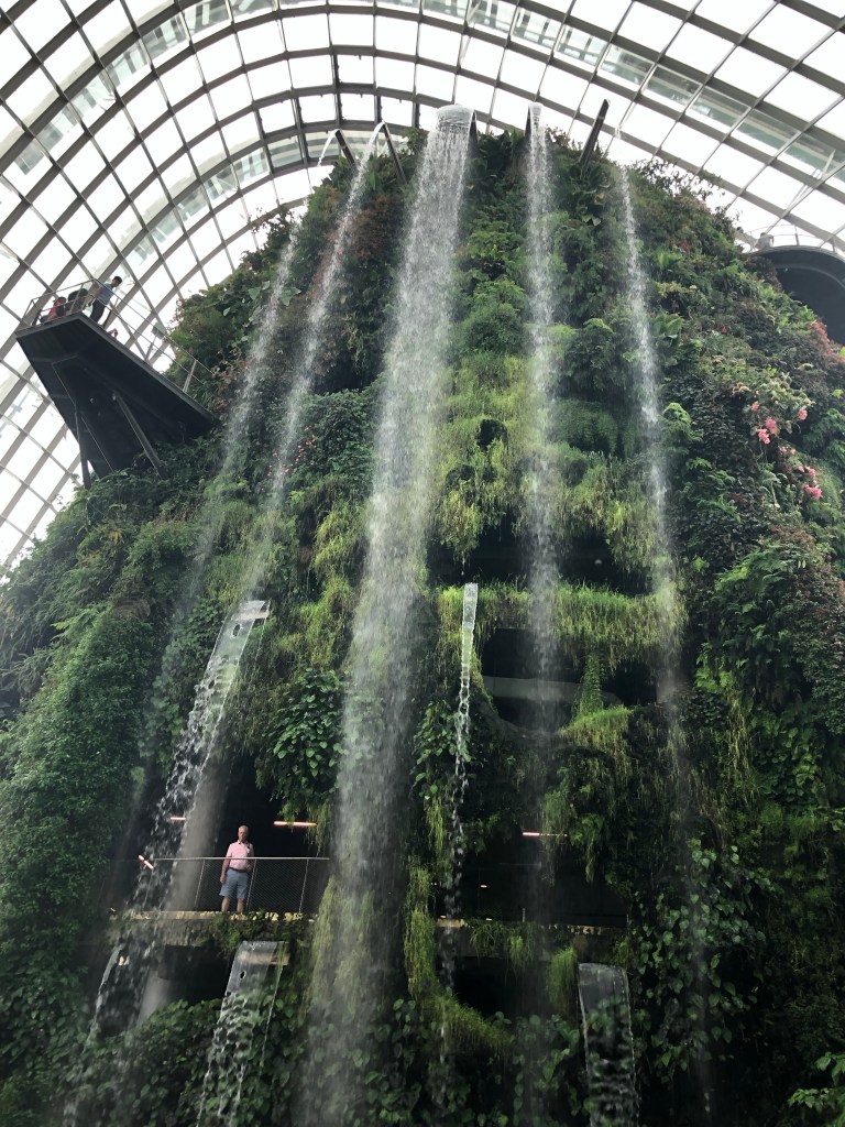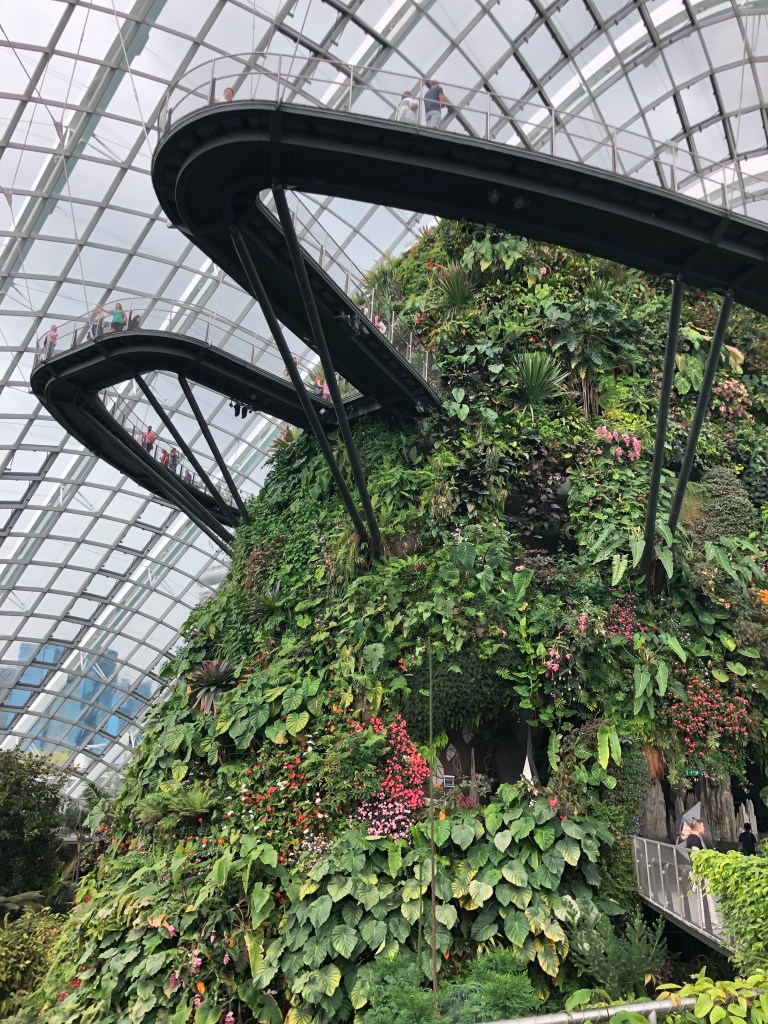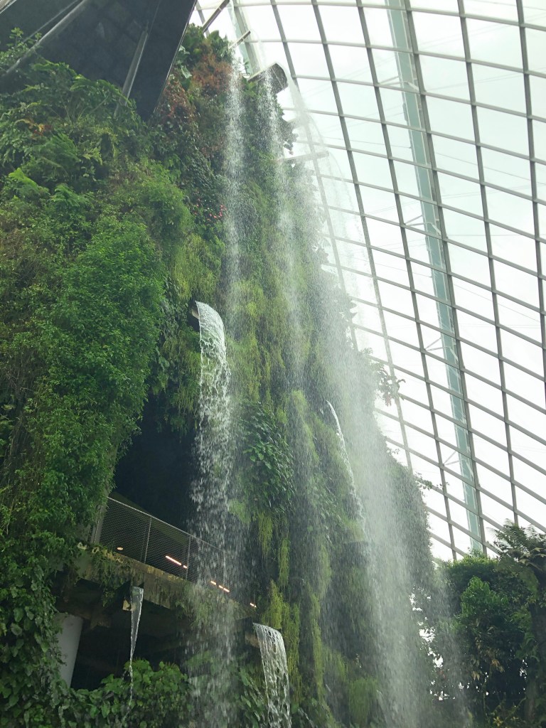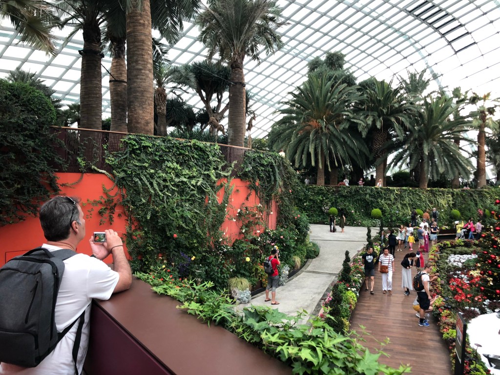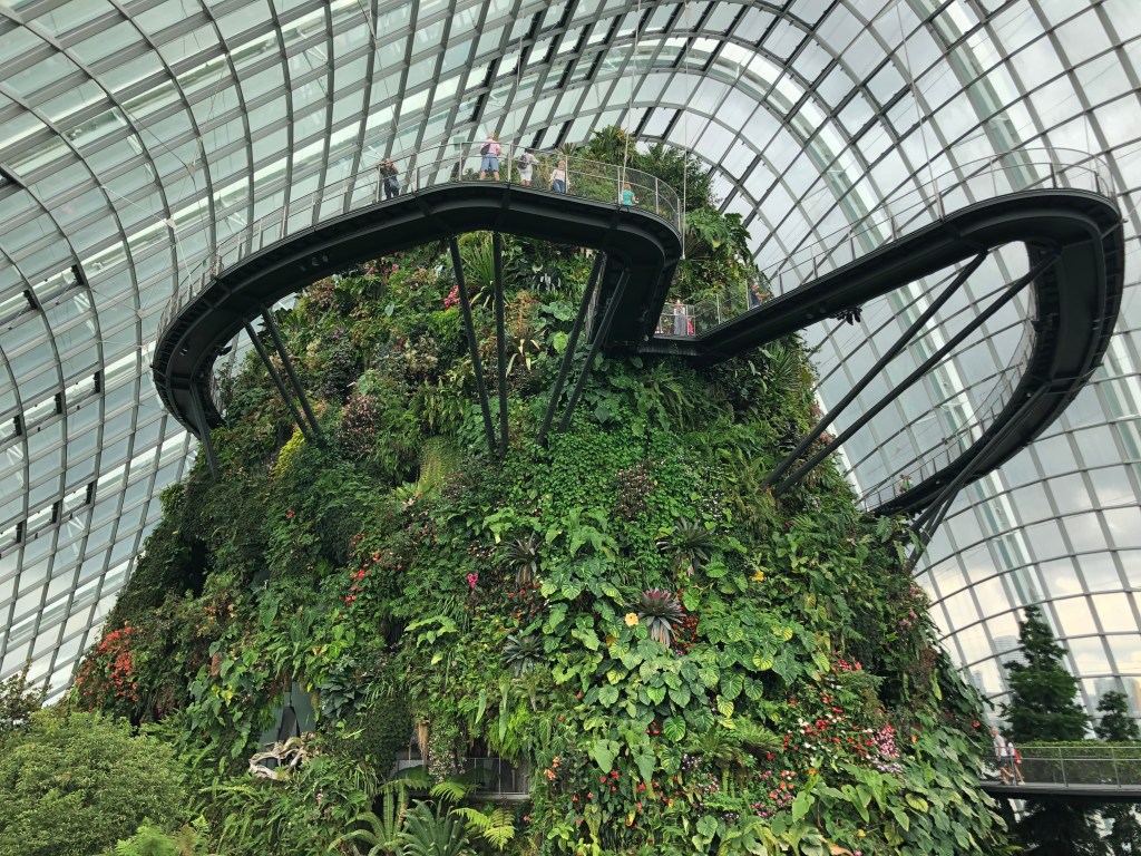 Then to the Sands at Marina Bay. I went to observation deck on floor 56. The roof gardens and infinity pool are for guests only. I would’ve liked to have seen it but not worth the $1000+ for a room (they get as low as $500 in February). The views of the city were good and the outdoor space was nice, but this was about 100 floors lower than where I stood in the Burj Khalifa. I had been ruined. After I had gotten my fill of roof action, heavy clouds came overhead. Back downstairs it was raining on one side of the building and not the other. I waited it out to go to gardens by the bay.