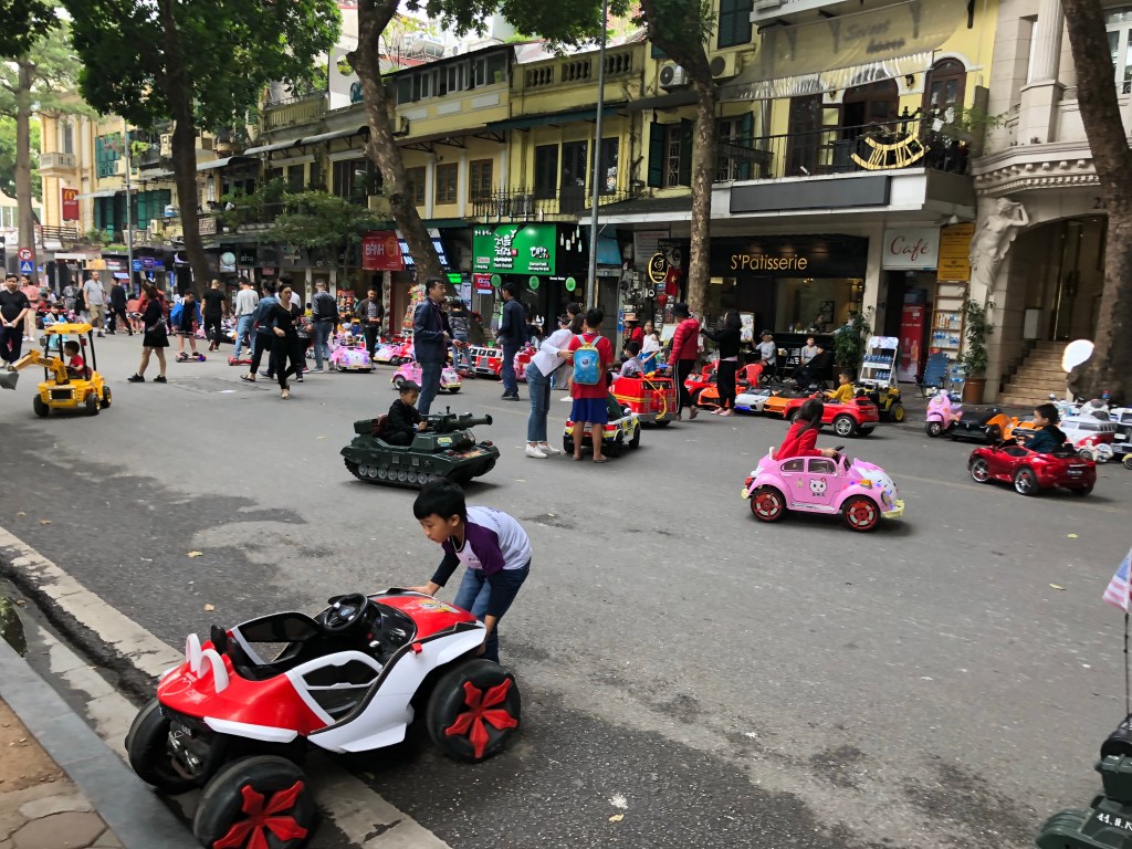 There was a street where parents helmed remote controls for their kids to ride electric vehicles