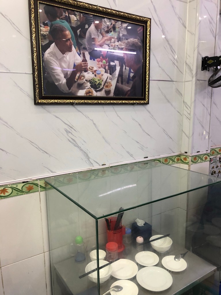 I sought Bun Cha, where Obama and Bourdain had dined a few years earlier. The food was good, but the shrine to Obama was more interesting. They had preserved the table he ate at behind a glass case and had photos of him everywhere.