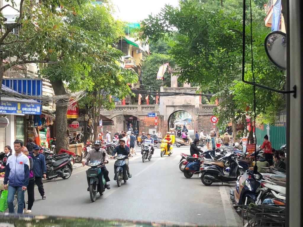 A standard Hanoi street. A historic gate, tons of bikes parked and in motion, and pedestrians haphazardly navigating it all