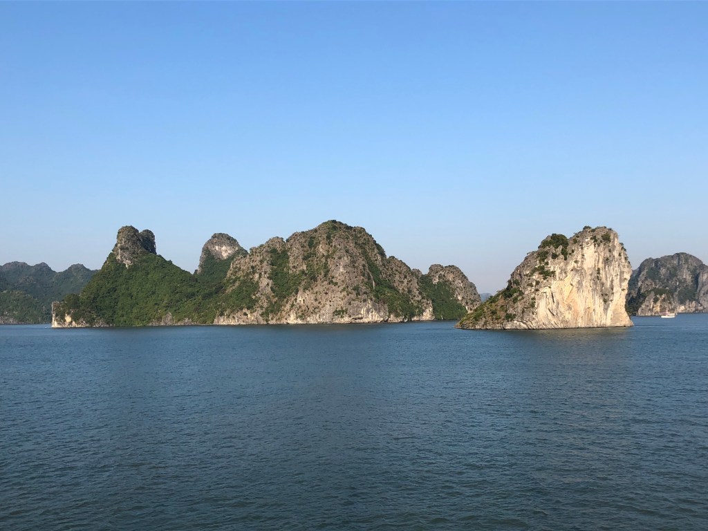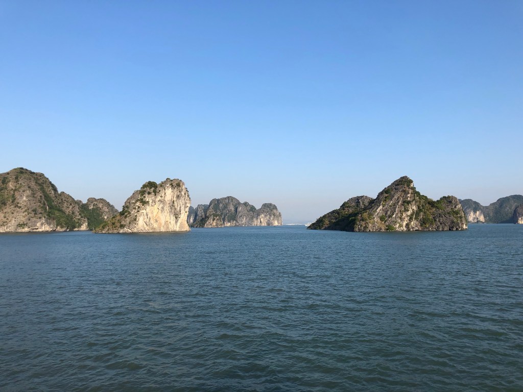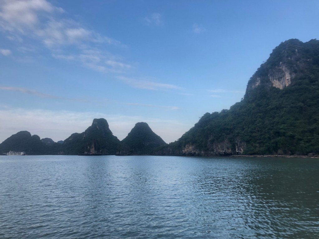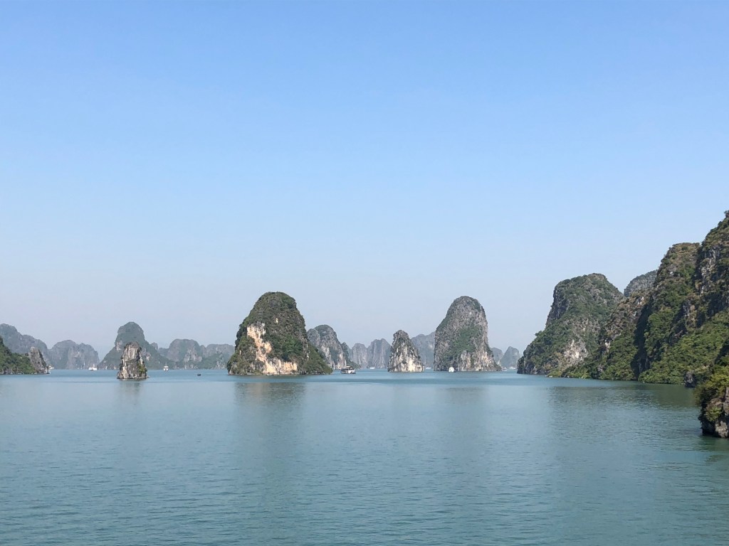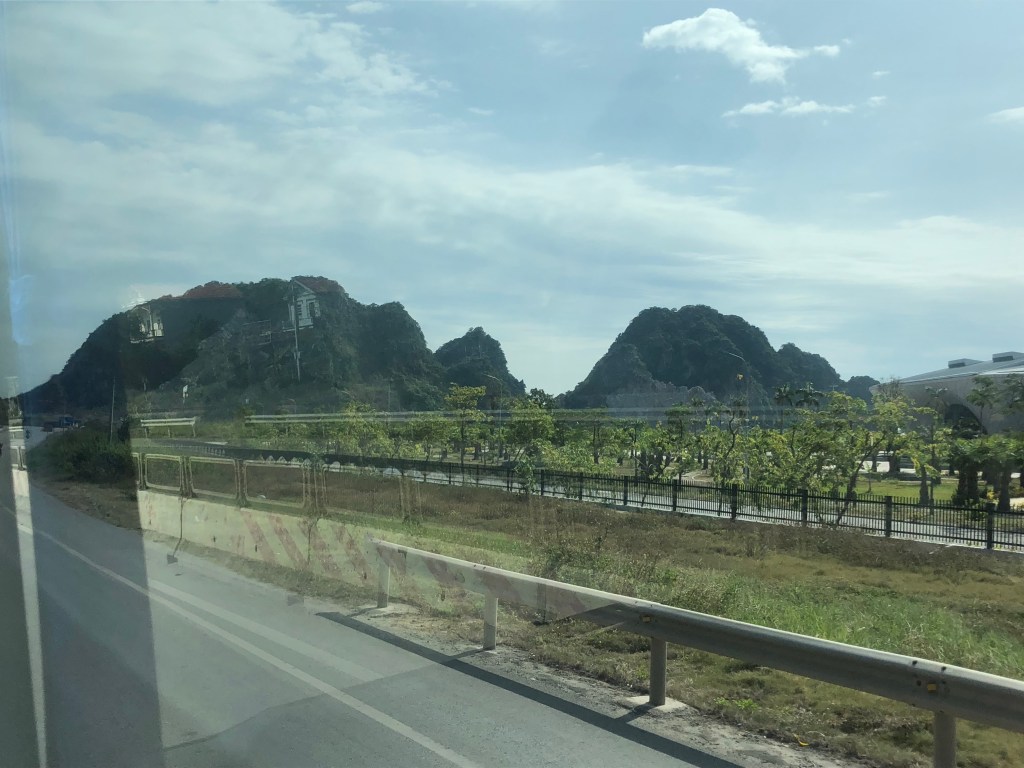 The next morning after some goodbyes to new brief friends in the hostel I took a 4 hour bus ride to my two-day boat tour of Halong Bay. Hostel morning said some goodbyes. The ride was pleasant and pretty, through some fields and towns, with hills in the distance.
