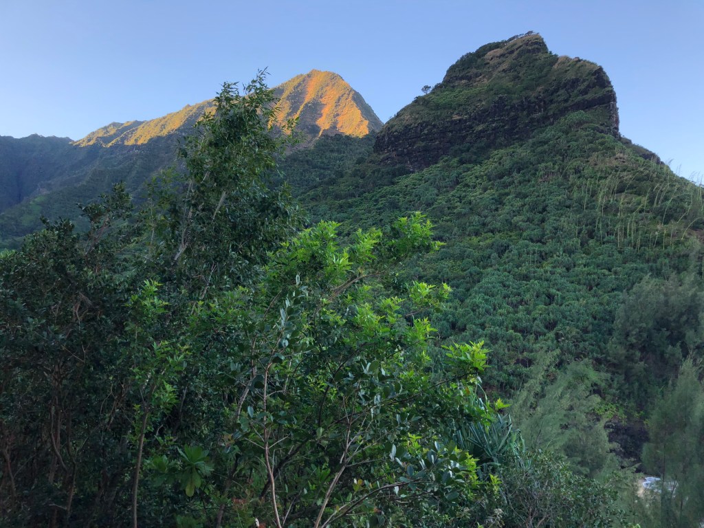 The next day I again got up before sunrise and went on a hike, this time to Hanakape Falls. Today I sought the trail early because I needed a permit to park. I had on good authority that the guard shows up at 6:30am, so I arrived at 6:20. The sunrise wasn’t until 7:13, so I put on Ziggy Stardust and waited until it was light enough to hike. The trail was pretty, beginning with an overlook and then zigzagging across a stream (river?) 6 times over a couple of miles.