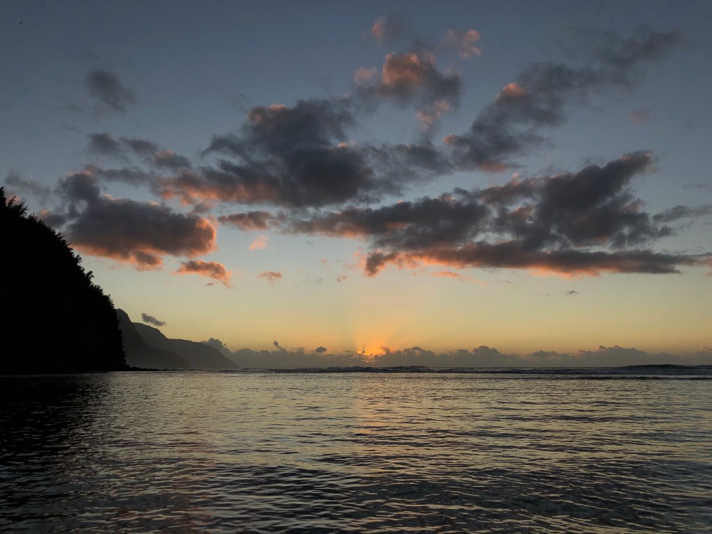 From Hana Lei I went to drive back to the hostel, but the traffic was awful. I figured there was no reason to sit in my car for an extra 30-60 minutes when that time would be better spent sitting on the beach. Sunset wasn’t too far off, so I went back northwest (the hostel was southeast) to do a little beach hop and watch the sun descend. First was Ha’ena Beach, where the rocks near to shore made for some extremely calm water with beautiful reflections.